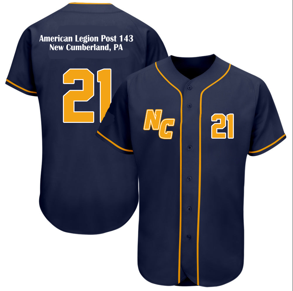 Minors Replica jersey. Navy full button down with Gold Trim. Gold NC on right front pocket. “21” on left front pocket area. “American Legion Post 143” on back with large “21.”